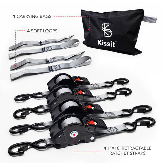 KISSIT Retractable Ratchet Tiedown Straps - 1209lb Max Break Strength - Includes 2 1" x 10 Tie Downs
